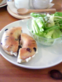 ランチにベーグルのチーズサンドとサラダのセットに